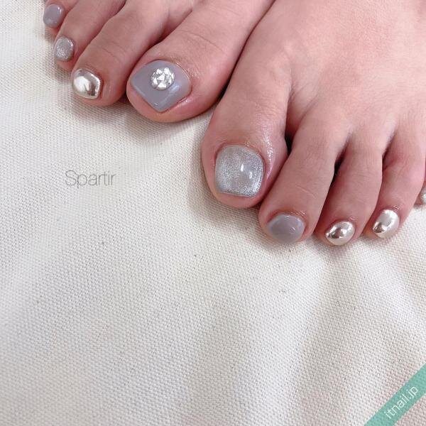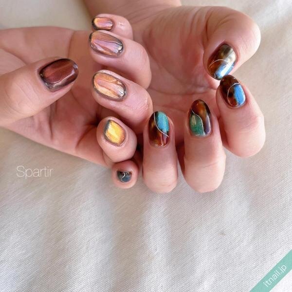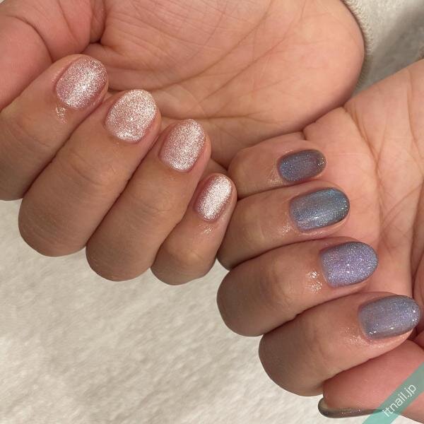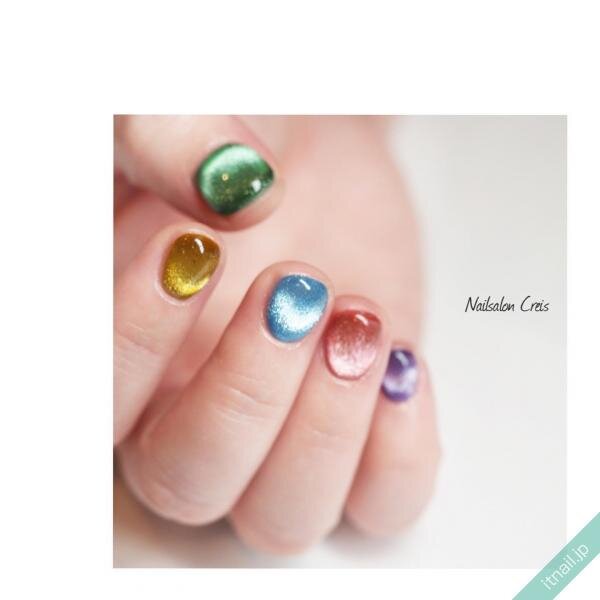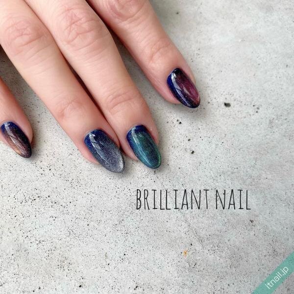 ビー玉感やギャクシー感たっぷりのちゅるんネイル。アシンメトリーで個性もバッチリです。角度によって見え方が変わるマグネットジェルの特徴を、最大限に活かしたデザインではないでしょうか!