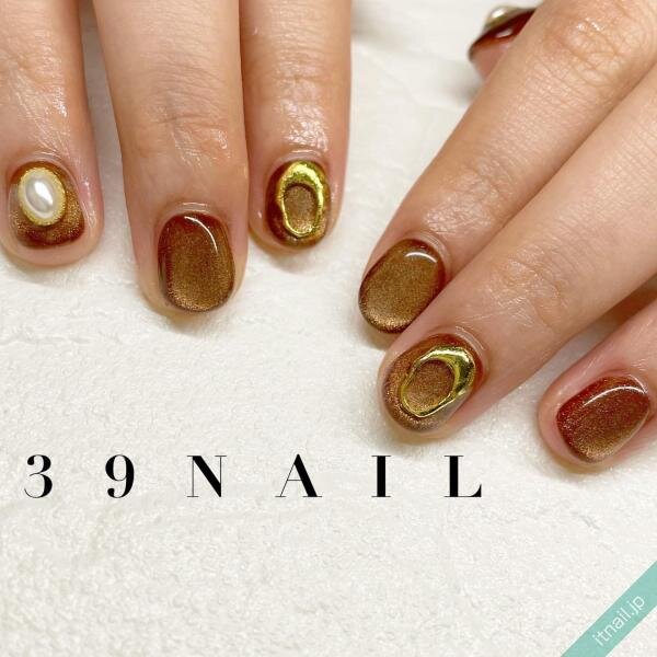 ベースカラーとマグネットジェルのカラーを変えることで、奥行き感やビー玉感を演出することができます。ボルドーのベースとゴールドのマグネットが相性バッチリですね!パールやゴールドのパーツでさらに大人クールな印象に。