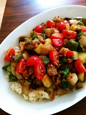 夏野菜とひき肉のゴマ味噌丼