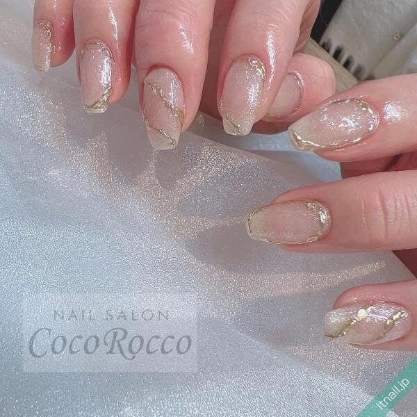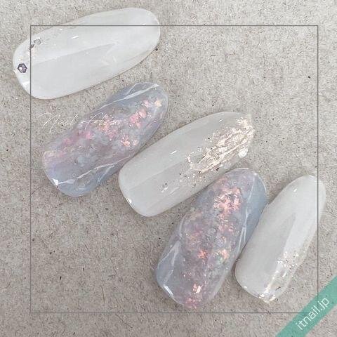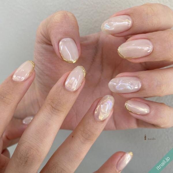 ミラーフレンチも可愛いですが、爪の先端にすべて入れるのではなく、偏った入れ方をしてニュアンス感を引き出すのも素敵です。清楚なオーロラネイルをベースに、輝きをアップさせてみて♡特別な日にもぴったりなネイルです。