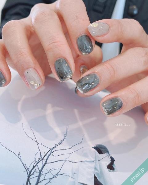 もやもやしたネイルデザインをベースに、爪の先端に少しだけミラーラインを入れるのもおしゃれです。もやもやネイルによるニュアンス感と、くすみのあるネイルカラーによってアンニュイな仕上がりが楽しめます。