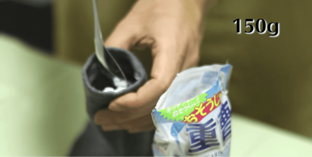 まずは靴下に重曹150gを入れます。