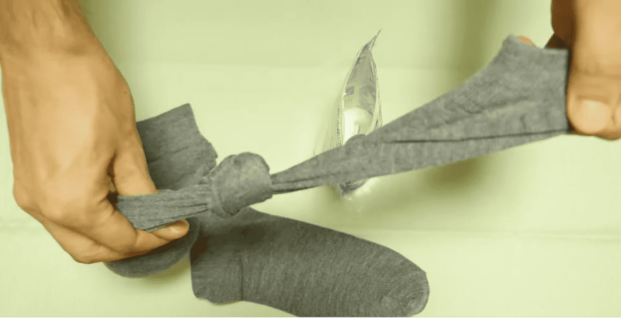 次に重曹を入れた靴下を結びます。