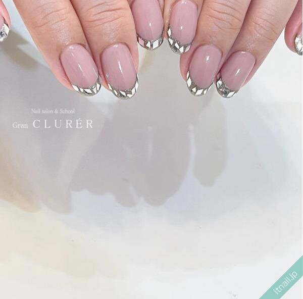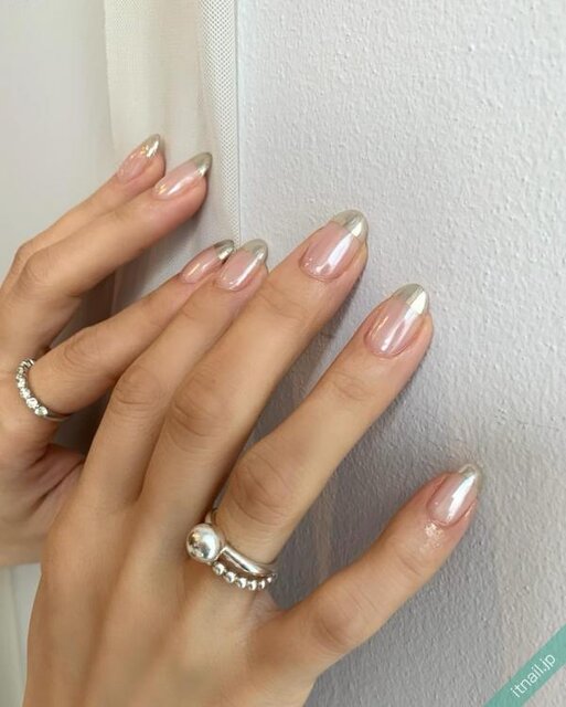 力強い輝きがモードな魅力を引き出してくれるミラーネイル。印象的なカラーは、フレンチネイルで色の分量を減らして主張しすぎないデザインに。フレンチネイルの適度なきちんと感が大人の女性にも似合う遊び心のあるミラーフレンチに。リングのシルバーと合わせて統一感のある仕上がりに。
