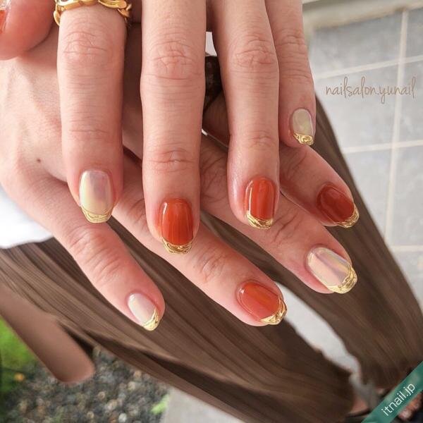 ネイルベッドに旬なテラコッタカラーを入れて華やかさアップ。ミラーネイルの部分に凹凸を付けて立体感のあるきらめきを。光の反射を利用して、シンプルながらお洒落なデザインに。
