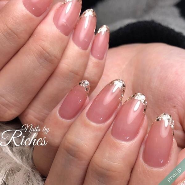 フレンチのフリーエッジの部分にラメやホロをたっぷり施したガラスフレンチ。クールで洗練された雰囲気が様々な世代の方に人気のデザインです。ストーンがなくてもラメやホロの輝きで十分ゴージャスです。