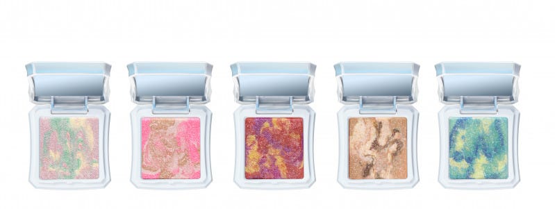 マーブルアイスのような模様で複数のカラーがMIXされているから、混ぜても、お好みの色だけを使ってもオッケー。オイルコーティングしたパウダーが、まぶたにしっとりとフィットして、クリアな発色と今っぽい透け感を実現してくれます。夏らしい涼しげな目元を演出してくれるパールのツヤ感も絶妙!