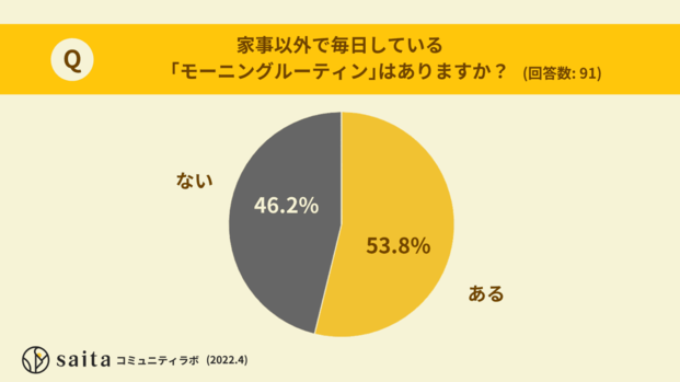 今回saitaでは、独自のコミュニティ組織「saitaコミュニティラボ」で91人の女性に「家事以外で毎日しているモーニングルーティンはありますか?」とアンケートを行いました。