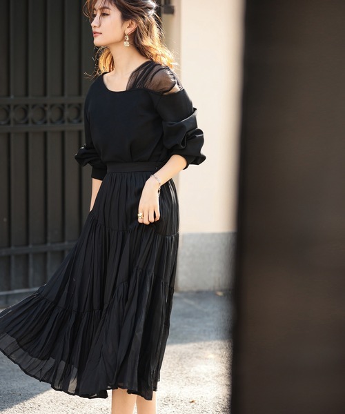 レトロな雰囲気が今っぽいこちらのワンピ。シフォンの透け感が夏の黒にぴったりな涼やかな印象を作ってくれます。