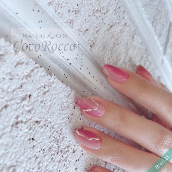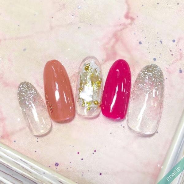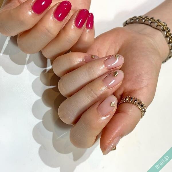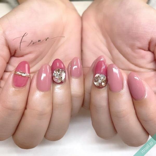 こちらも濃いめのピンクをワンポイントに入れて、他の爪は優しいピンクネイルにしたデザインです。ピンク系で一体感はあるものの、濃いピンクが指先の存在感をアピールしてくれていますね♪ラメやシェルを飾ってキラキラさせるのが人気です。