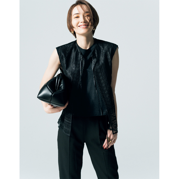Tシャツにトレンドのジレを羽織ったら、それだけで洗練見え! 透け感があるから、オールブラックでも重たさとは無縁のスタイルに。