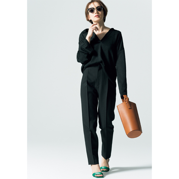 パンツ¥18,700(アダム エ ロペ)スキッパーニット¥9,990(バナナ・リパブリック)バッグ¥51,700(土屋鞄製造所/土屋鞄製造所 お客様サポート係)サンダル¥10,780(ル タロン グリーズ/ル タロン グリーズ ルミネ新宿店)イヤリング¥3,150(アビステ)サングラス/スタイリスト私物