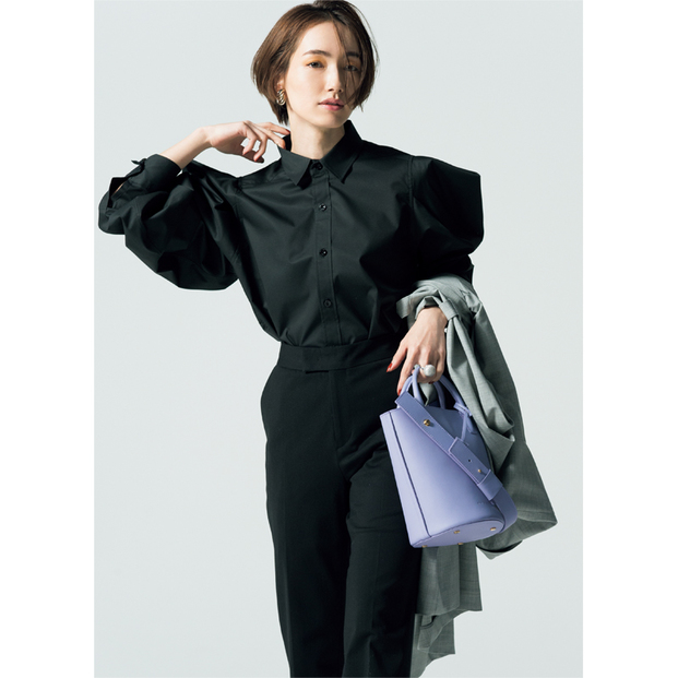 シャープなパワショルで構築的なフォルムのシャツは一枚で着映え力抜群。きれい色に頼らず、いっそ黒一色に徹する方がオシャレに見える説!