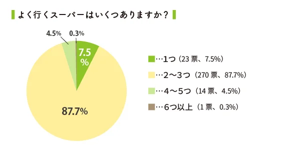 よく行くスーパーは「2~3つ」という回答が9割弱と、大多数を占めました。スーパーによっても扱っている商品の特徴が違ったり、お買い得の曜日が異なったりもするため、2~3店舗を使い分けて上手に買い物をしているようです。