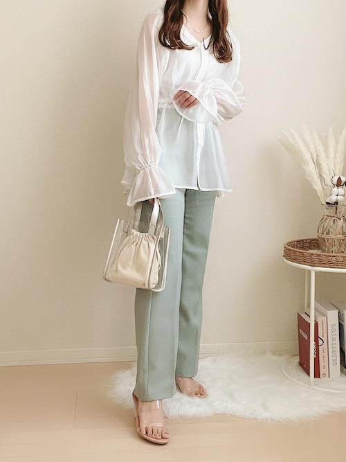 クリア素材のバッグや靴で、より清涼感のあるコーディネートに仕上げていますね。