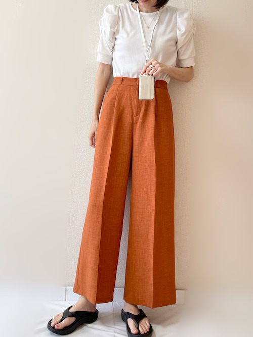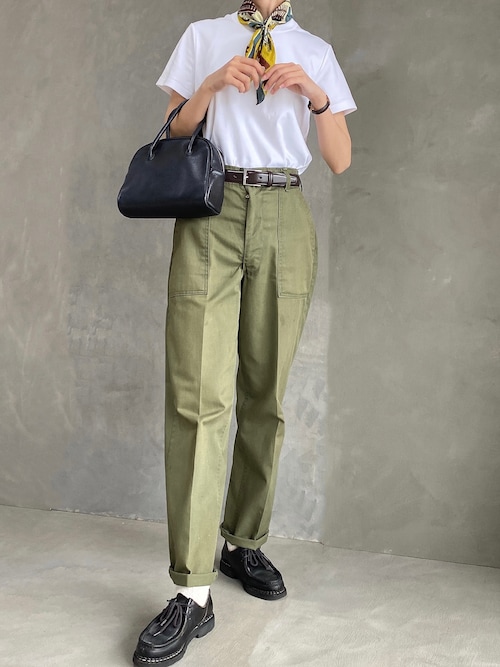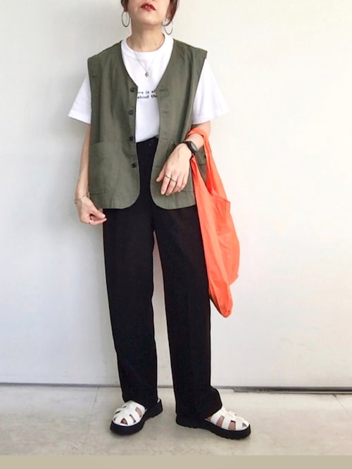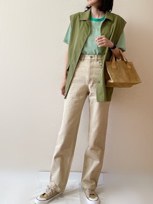 薄いグリーンのパンツも、夏らしい涼し気なコーディネートを実現してくれます。