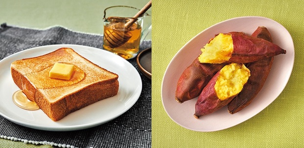 左・厚切りトーストも中まで熱々の完璧な焼き上がり。右・〈じっくり焼きいも〉は新搭載のコース。
