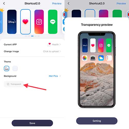 全てのアプリを設定したら、バックグラウンドにある『Transparent』をタップして、「Setting」ボタンより背景透過の設定をおこないましょう。