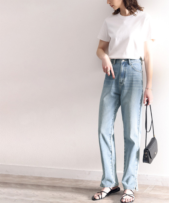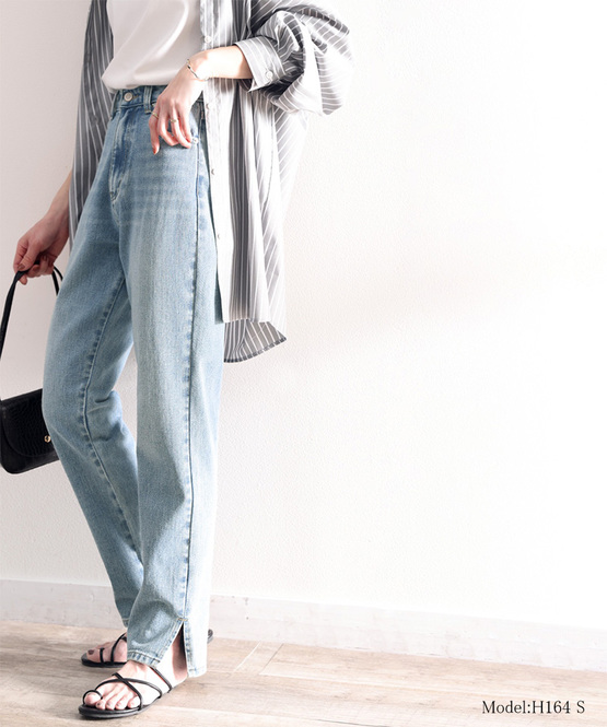 腰位置を高く見せるハイウエストデザインや裾のスリットなど、美脚見せを叶えるディテールが詰まったデニム。