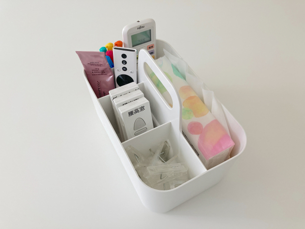 持ち手付きなので使いたい場所にそのまま移動できるほか、小物類がすぐにまとまるのでリビングのリセットが一瞬で終わります。
