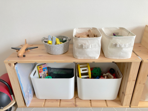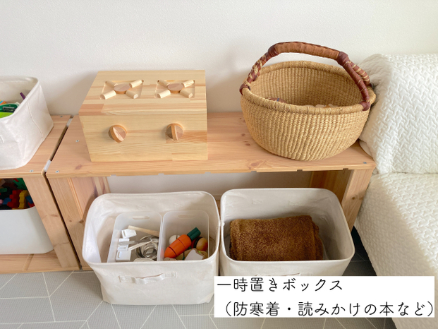 我が家のリビングはおもちゃ収納がメインですが、おもちゃ収納の一角に「大人の一時置きボックス」を設けています。