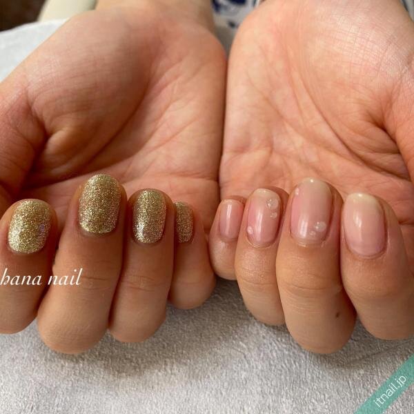 続いてのアシンメトリーデザインも、さりげない桃ネイルの取り入れ方が絶妙!一見シンプルなヌーディーネイルに見えますが、実はほんのり色づいた桃のようなネイル♡ふわっと高揚した頬のようで、愛らしさが抜群です。反対側の手にはぎっしり詰まったグリッターネイルを合わせて、ギャップのあるコーディネートを楽しんでみてくださいね。