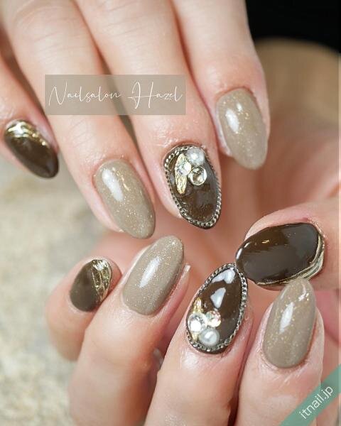 ブラウンのワンカラ―×ラメ入りベージュのワンカラ―の、シックなデザインを見ていきましょう。ブラウンの根元にはストーンがあしらわれており、部分的にトレンドのミラーネイルも施されていますね。それだけでも十分素敵なのですが、ストーンの爪をチェーンで囲むとオシャレ感が増します。