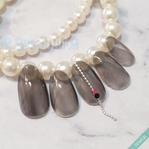 チェーンを使ったアレンジには、「垂らす」という方法もあります。ブラックのシースルーネイルをすべての爪に施し、中指だけシルバーのチェーンを装着しましょう。チェーンの下部はあえて残し、爪から垂らします。ピンクとブラックのストーンを乗せてもカッコいいです。セルフネイル派の人は、シースルーネイルではなく、普通のワンカラ―×チェーンでも大丈夫ですよ。
