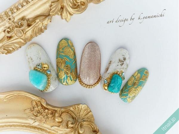 また、チェーンは、別のアイテムや爪の根元に添わせることもできます。例えば、大きめのターコイズストーンにゴールドチェーンを添わせてみてはいかがでしょうか。何もつけない場合と比べて、ターコイズストーンを引き立たせることができます。ラメ入りベージュのワンカラ―ネイルの根元に添わせたチェーンも、重厚感が出て良い感じですね。