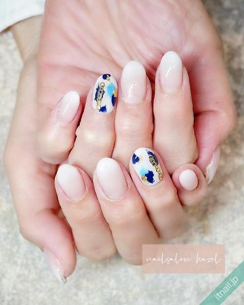 ホワイトベースにブルー×水色の色を乗せたアートは、爽やかな雰囲気ですよね。その上に、スタッズやストーンをプラスする方も多くいらっしゃると思いますが、今回はあえてチェーンを乗せてみましょう!縦のラインになるように装着すると爪長効果も期待できますよ。ほかの爪は乳白色にして、ナチュラルにきめてみてくださいね。