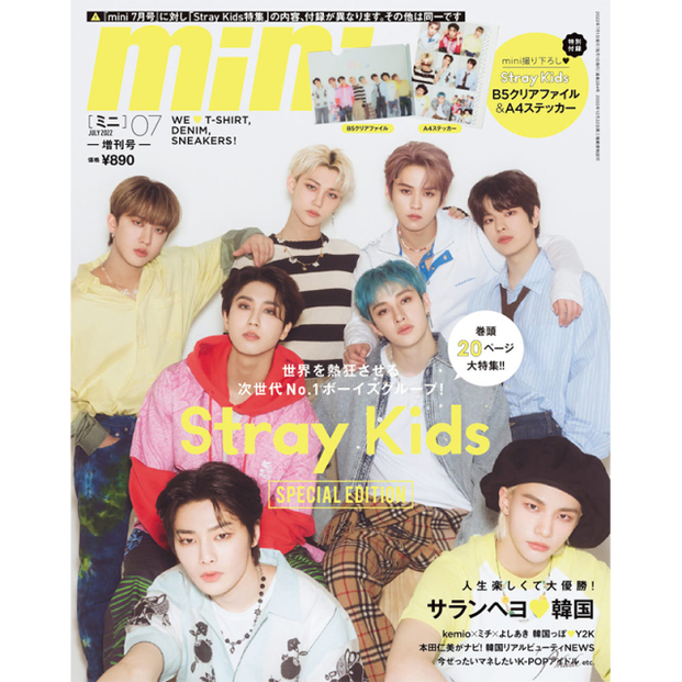 韓国の8人組男性アイドルグループStray Kids(ストレイキッズ)が初表紙を飾る「mini」7月号。書店、ネット書店限定販売の増刊には、miniが撮り下ろしたStray KidsのB5クリアファイル&A4ステッカーがついてきます。