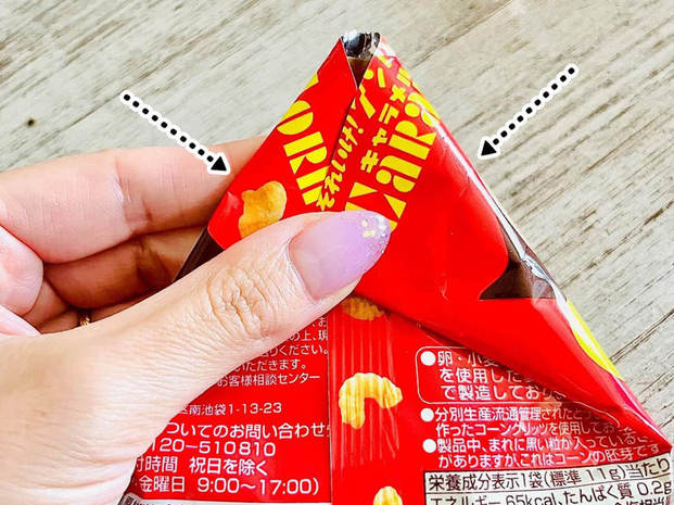 クリップや輪ゴムなどの道具不要!「お菓子の袋をしっかり閉じる方法」を紹介します。覚えておけば、外出時や道具がないときにも便利ですよ☆