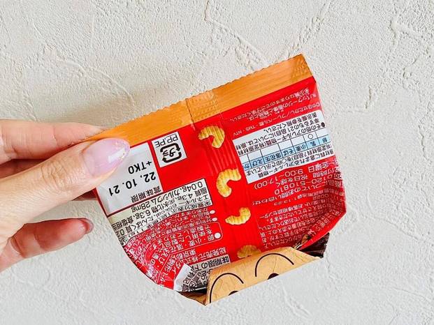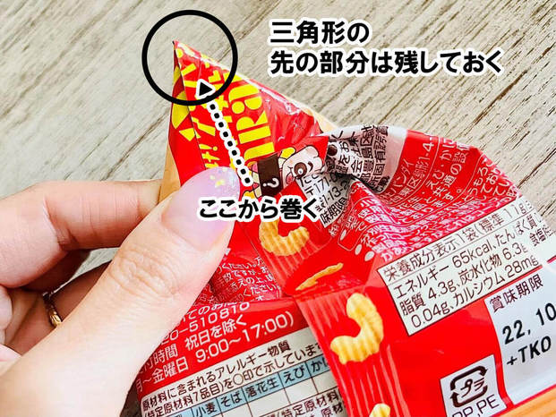 こちらが完成形です。クルッと巻いた部分は戻ることなく、しっかりと固定されています。お菓子の袋を振っても、中身が出てくることはありませんでしたよ。