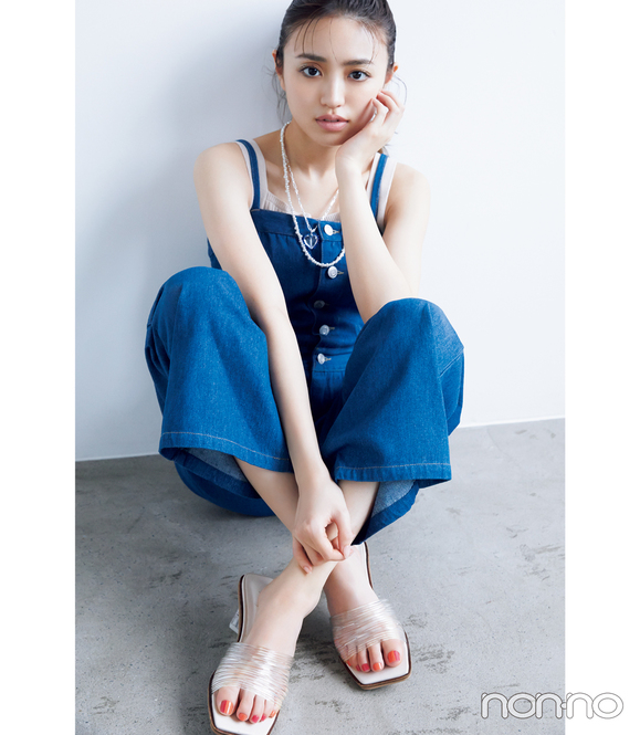 靴(5.5)¥5999/セスト(SESTO) タンクトップ¥4400/リゼクシー渋谷109店 サロペット¥6600/アンティローザ(Auntie Rosa Holiday) ネックレス(パール)¥2860/サンポークリエイト(アネモネ) ネックレス(ハート)¥11000/MEEE