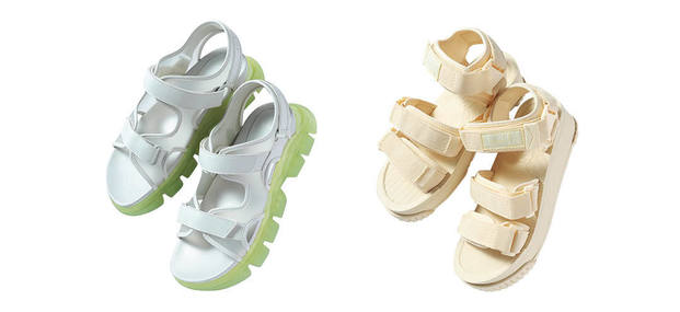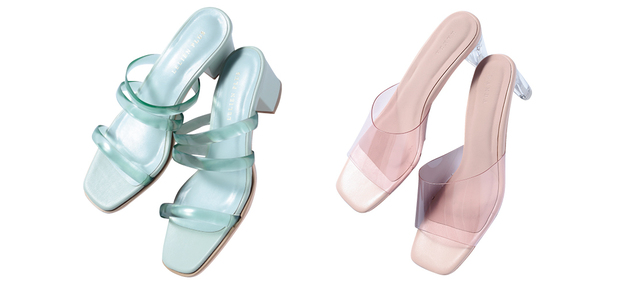 涼しげムード高まるPVC素材のサンダル。 フルーツみたいにフレッシュな2色を使ったちょこっとアートをアクセントに!