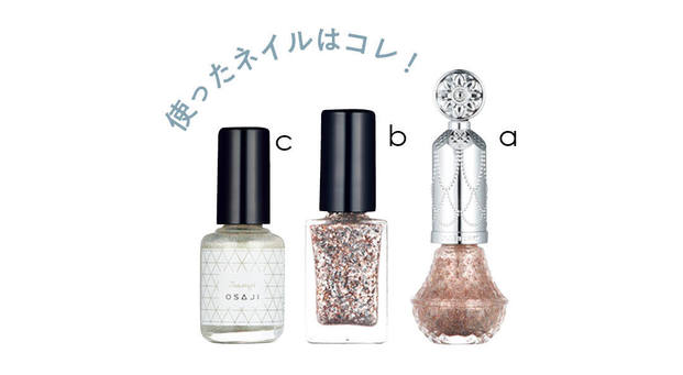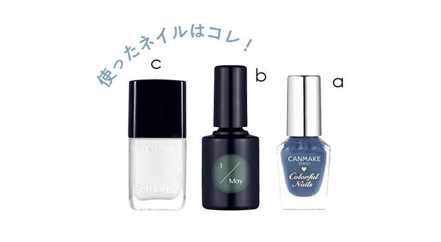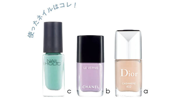 中指以外にベースとしてaを2度塗り。よく乾かしたら、先端にbとcで交互に細いラインを。中指はbを2度塗りしてアクセントに。