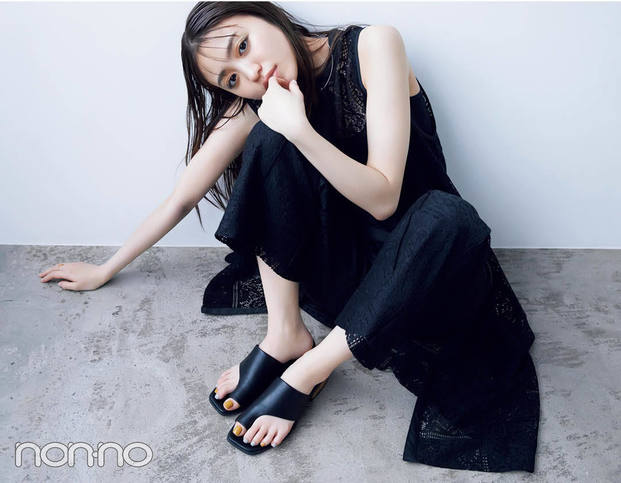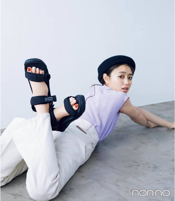 サンダルの存在感を引き立てながら、さりげない色遊びを楽しんで。ニュートラルな色をベースに選び、きかせ色にはサンダルと同系色&反対色を一つずつ、淡いトーンでチョイス♡