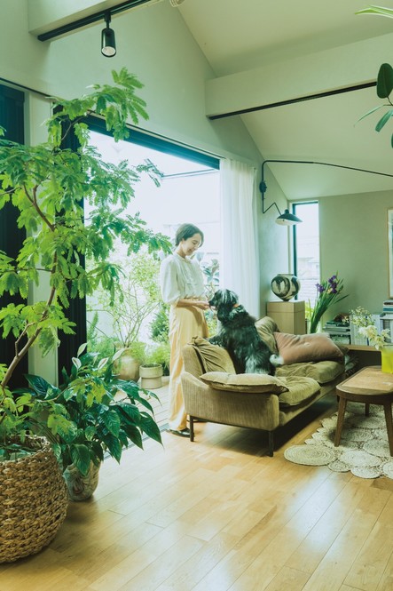 東京・中目黒で、生花店〈farver(ファーヴァ)〉を経営する渡辺礼人(あやと)さん・安樹子さん夫妻。5年前から住み始めた2階建ての家のリビング&ダイニングルームは、天井から日光が降り注ぎ、テラスからの風が吹き抜ける、植物が育つのに最高の空間だ。
