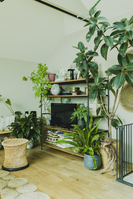 TVの存在感をなるべく薄めるため、周りにはグリーンを特に多めに置いている。「1つのコーナーにいくつか置く場合は、緑の濃淡や葉の大きさや形、高さなどが異なるものを、バランスを見ながら組み合わせるのがポイント。メリハリがつくことで、奥行きのある空間になります」(安樹子さん)