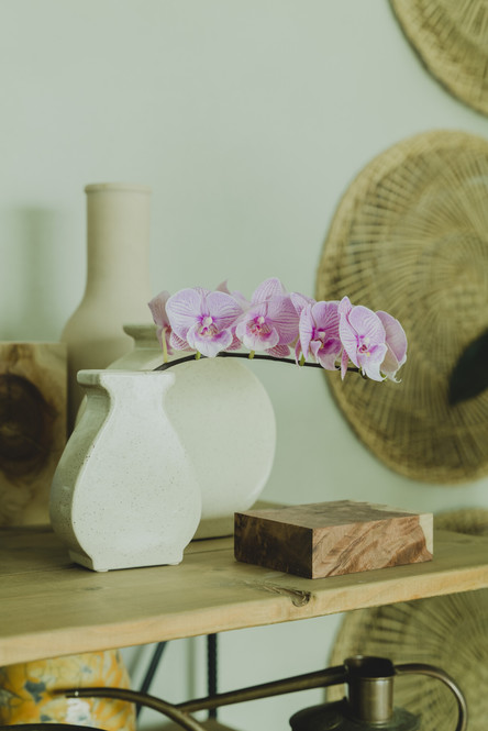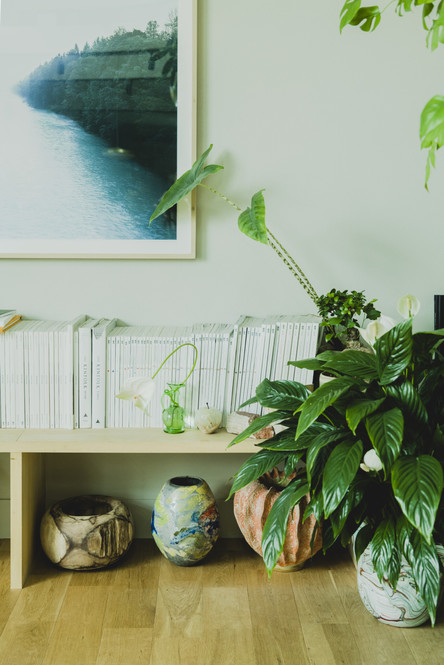 オブジェ的な要素の強いカラフルなフラワーベースは、使わないときは“見せる収納”スタイルで片付け。「床や壁が木目やアースカラーなので、アクセントになる花瓶を選んでいます。眺めているだけでも楽しいし、シンプルに葉っぱだけを生けても絵になりますよ」(礼人さん)