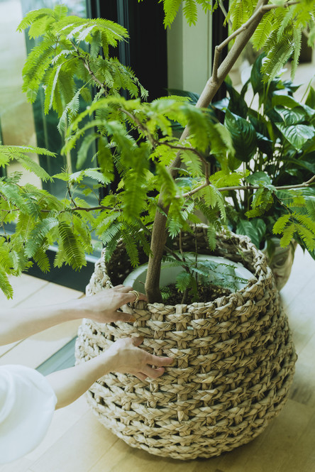 リビングのポイントになっている大きめのエバーフレッシュは、買ってきたときのプラスチックの鉢のまま、バスケット形の鉢カバーへ。「カバーを引くだけで軽々と動かせるので、移動がラク。見た目もスッキリしてインテリアにもなじみやすいし、カバーだけなら替えるのも簡単です」(礼人さん)