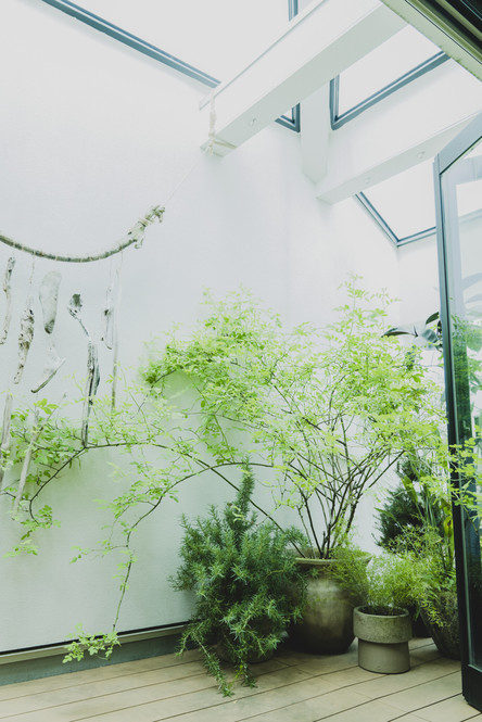 テラスは暑さ・寒さに耐久性のある植物がメイン。日当たりと風通しを良くするために屋根は設けていない。「一部、寒さで凍傷になったり、葉を落としたものもありますが、新芽が出る可能性もあるので様子を見ています。室内同様、葉の形状や色合い、高低差でリズムをつけて」(安樹子さん)