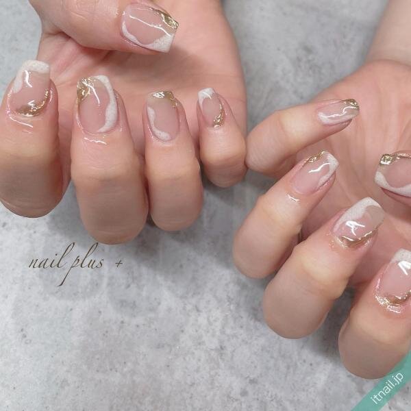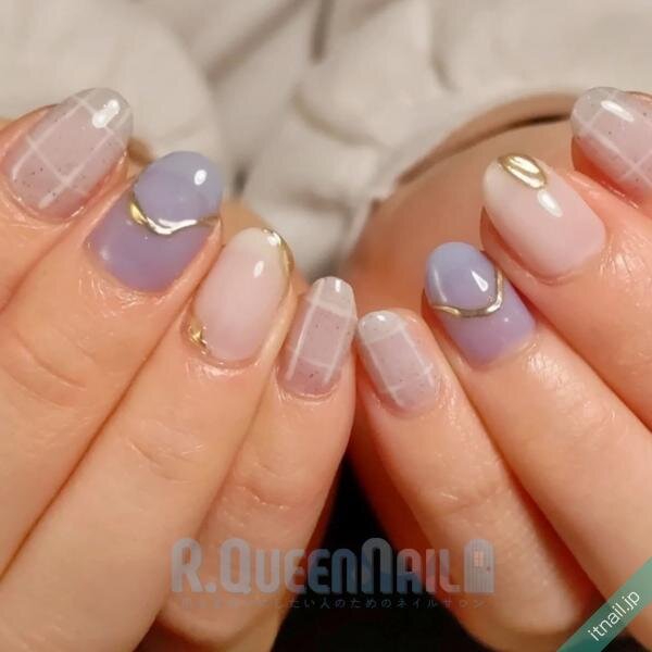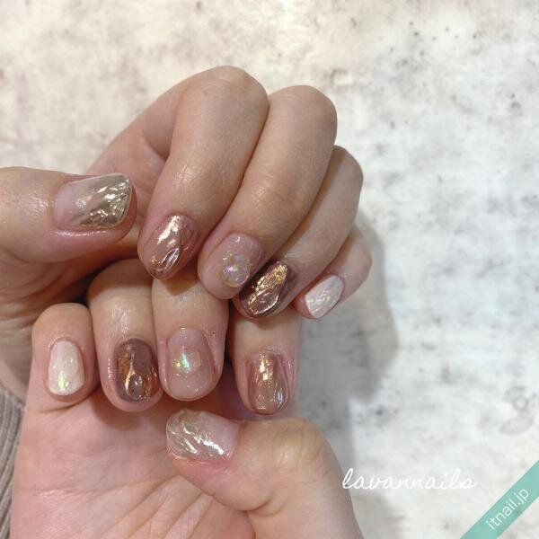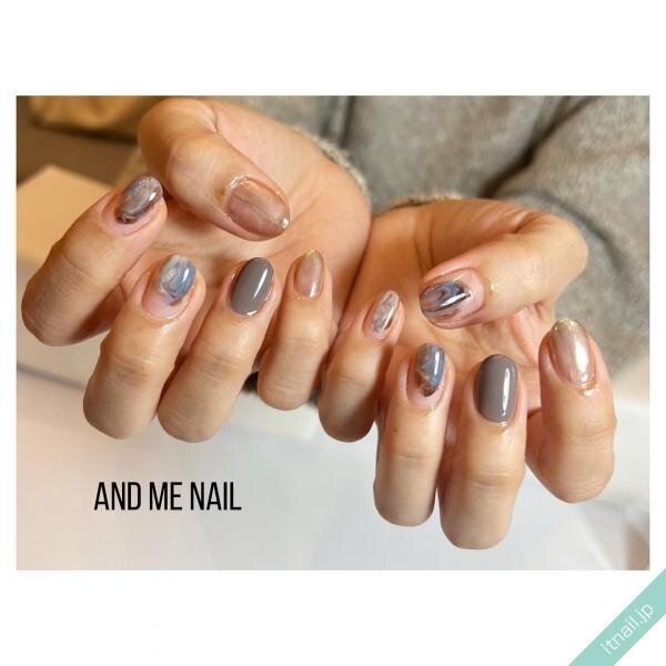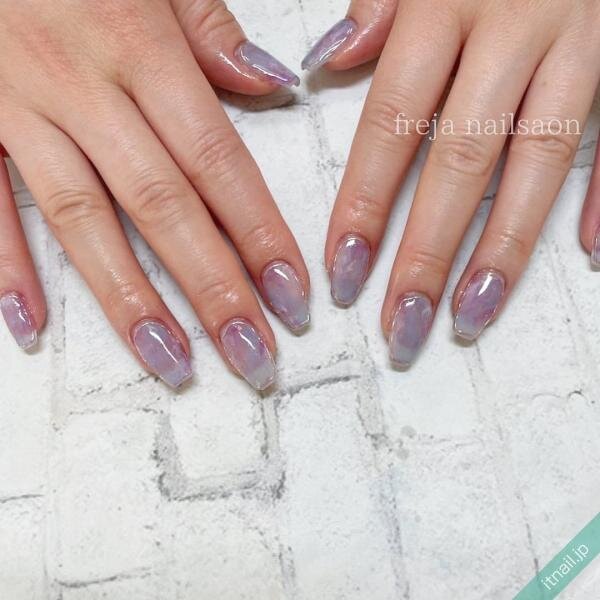 子どもっぽくなり過ぎない、大人のマーブルデザインです。シルバーで囲ったミラーデザインは統一感があり、指先をカッコ良く引き締めてくれています。シアーな透明感、ふんわりニュアンス感が抜け感を演出!