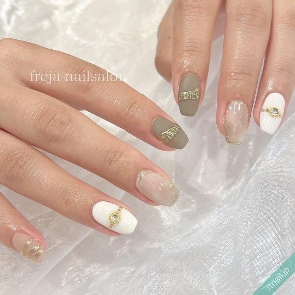 絶妙なくすみカラーとマット感がカッコ良いネイルデザイン。リングネイルでトレンドもバッチリ抑えています!かっちりし過ぎない、大人女子にピッタリの抜け感ネイルではないでしょうか。