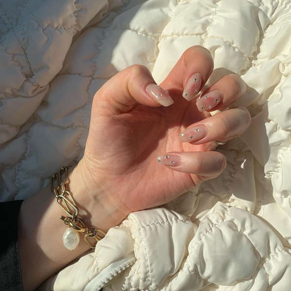 シンプルなチークネイルだとちょっと物足りない…という派手好きさんには、ストーンやクリアパーツをつけるのがおすすめです。