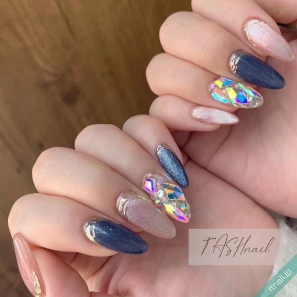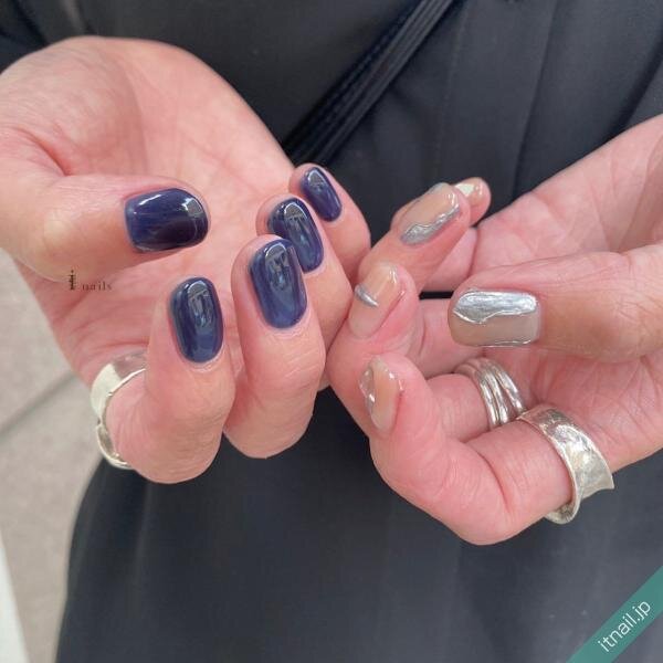 きちんと感のあるネイビーネイルに、抜け感をプラスしたいときは、ミラーアートが活躍してくれます。シルバーミラーのうねうねネイルなど、デザイン性のあるネイルをワンポイントに入れるだけで、指先もあか抜けますよ♡