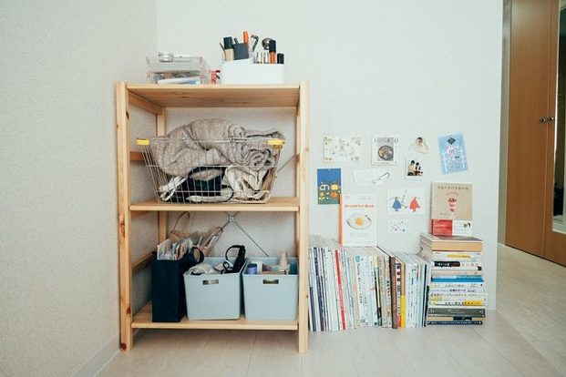 たとえば、こちらのオープン棚のように低めの収納棚を使って細々したモノを整理整頓してみてはいかがでしょう。生活雑貨などをカゴなどにまとめたり、持っている本を一箇所に集めたりするだけでも気分が軽くなります。モノが整理整頓されることで部屋も広く使えて一石二鳥です。