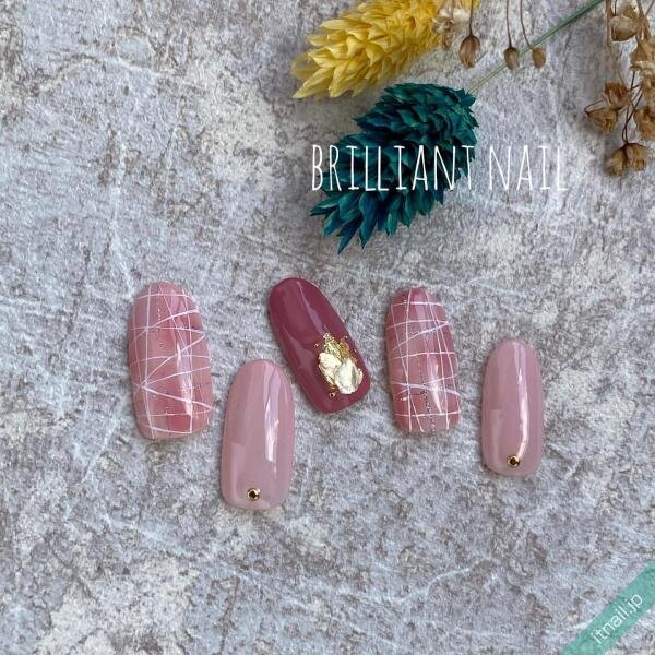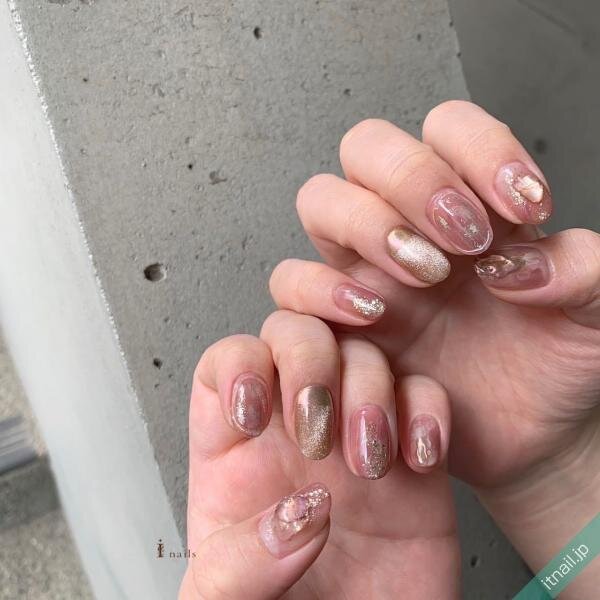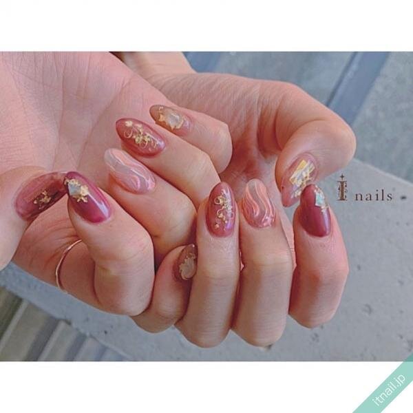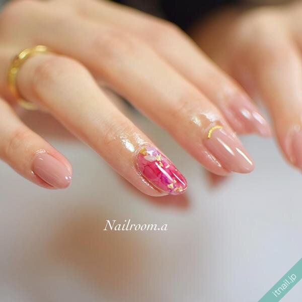 ちゅるんとさせたピンクネイルに、シェルや金箔を埋め込んだデザインも人気があります。シェルだけでなく、金箔を使うことで、高級感や大人っぽさを引き出すことができますよ♪少しくすみ感のあるピンクにすることが、ニュアンスデザインにするポイントです!