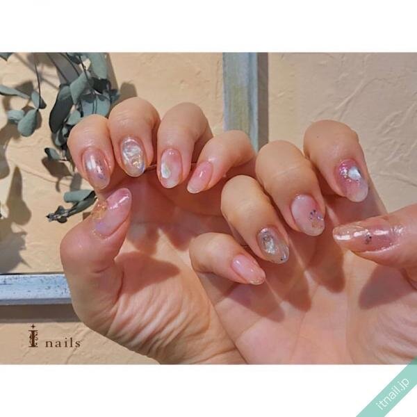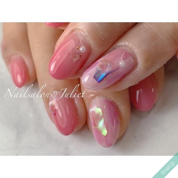 ピンクカラーで差をつけたシェルありのニュアンスネイル