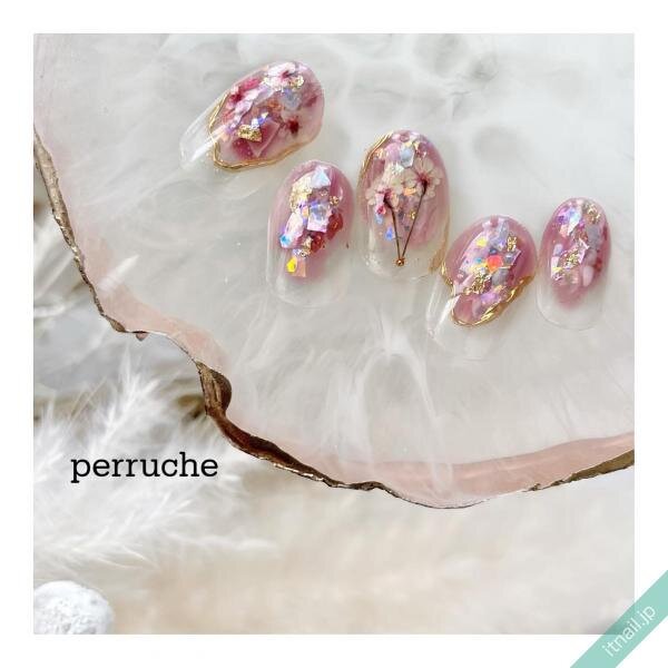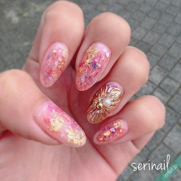 ピンクやシェルのニュアンスネイルには、フラワーデザインをプラスするのも素敵ですよ♪押し花とシェルを少し重ねながら置いていくだけで、可愛らしさが増した夏ネイルになります。クリアベースに、塗りかけピンクでニュアンス感を出してみて!